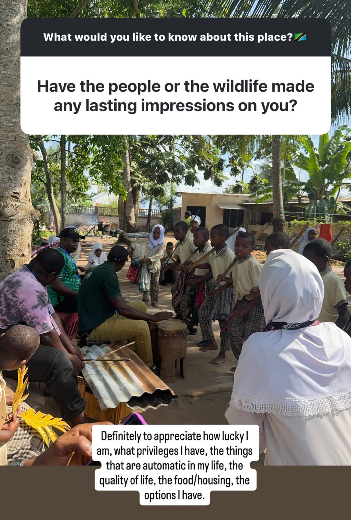 Теннисистка также рассказала, что её удивило: "Думаю, условия. Хотя Занзибар - туристическое место, во многих районах города царит крайняя нищета. С другой стороны, когда идёшь вдоль моря/пляжа и видишь эти прекрасные четырёхзвёздочные отели, изысканные рестораны и частную яхту, становится грустно, когда возвращаешься и видишь по пути маленьких детей, просящих милостыню на улице по ночам".